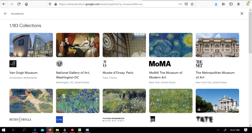 Untuk museum seni dan budaya, kita bisa mengunjungi Google Arts & Culture. Di sini, kita dapat menikmati koleksi ratusan museum seni dunia. Di antaranya Van Gogh Museum – AmsterdamNational Gallery of Art – Washington DCMusée d’Orsay – ParisMuseo Sorolla – MadridTokyo National MuseumSakıp Sabancı Museum – Istanbul. Kita juga bisa menikmati koleksi beberapa museum Indonesia, di antaranya Museum Nasional dan Unit Pengelola Museum Seni.
